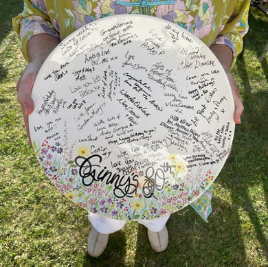 You or we paint your design on to a plate or another pottery piece of your choice, leaving a space for your friends or guests to sign at the party with the special pen. We will fire the plate before your event.